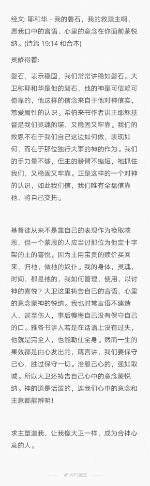 更新了一条心情: 【罗8:26】况且,我们的软弱有圣灵帮助,我们本不晓得当怎样祷告,只是圣灵亲自用说不出来的叹息替我们祷告。 【罗8:27】鉴察人心的,晓得圣灵的意思,因为圣灵照着 神的旨意替圣徒祈求。 【罗8:28】我们晓得万事都互相效力,叫爱 神的人得益处,就是按他旨意被召的人。 全文